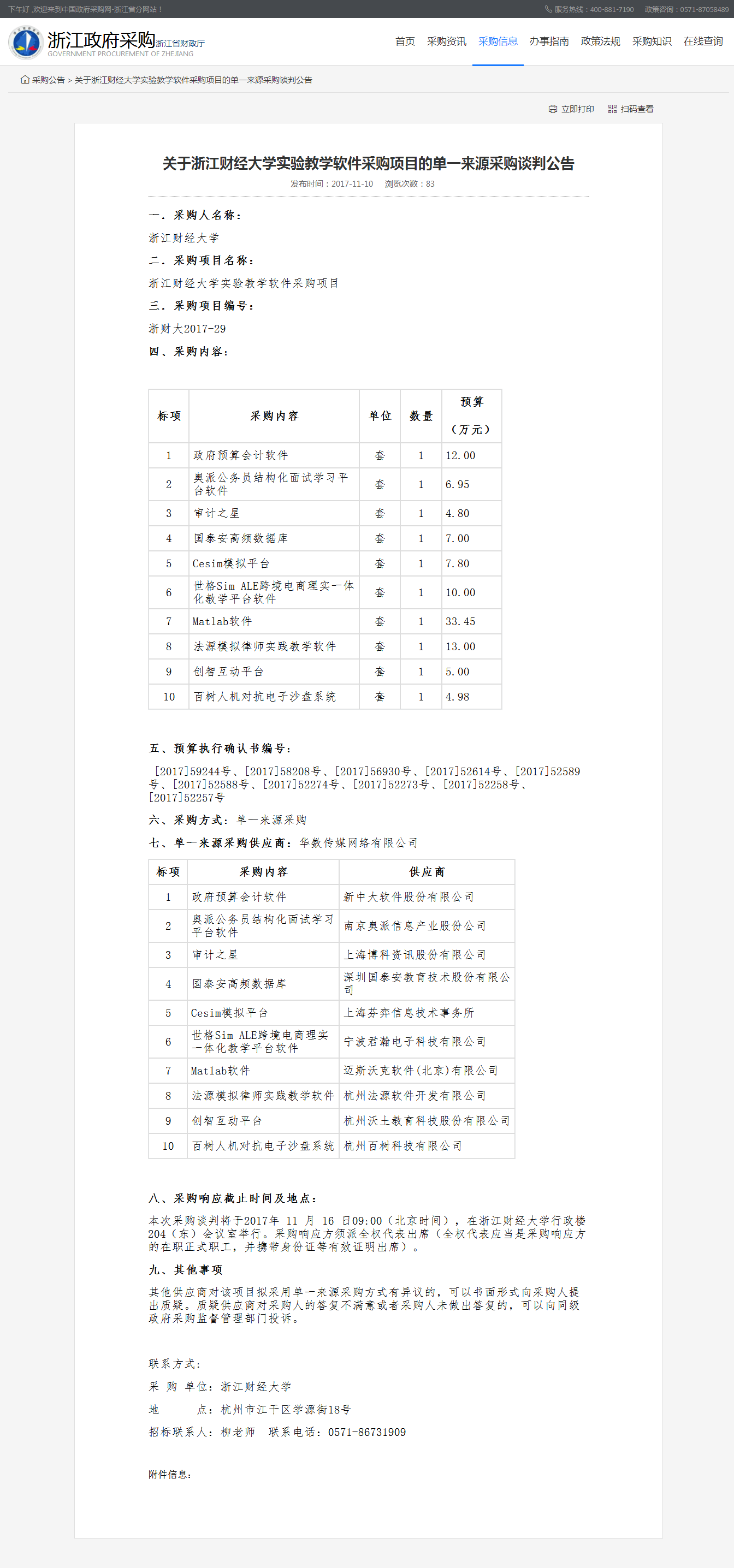 【浙财大2017-29】关于浙江财经大学实验教学软件采购项目的单一来源采购谈判公告