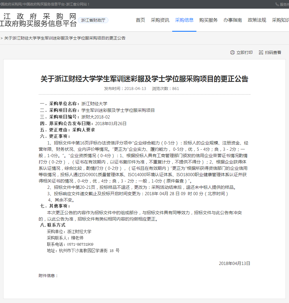 【浙财大2018-02】浙江财经大学关于学生军训迷彩服及学士学位服采购项目的更正公告